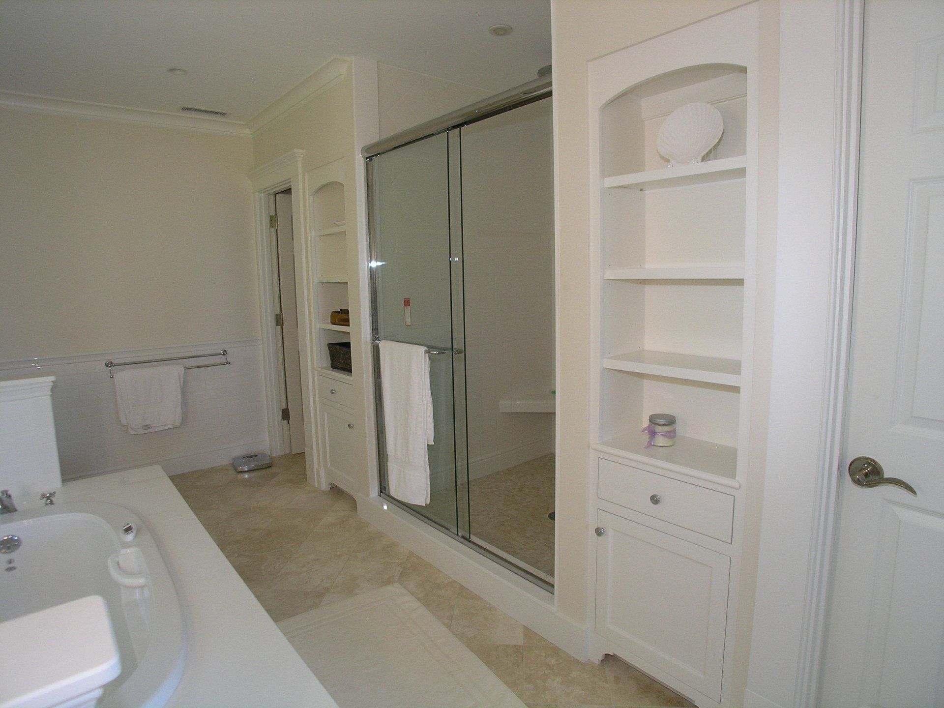 White built-ins around shower enclosure