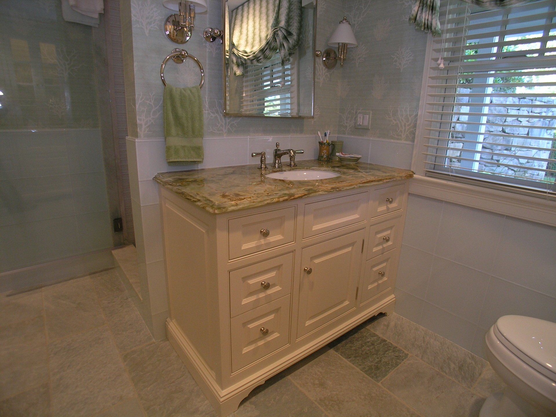 Furniture-style vanity and linen cabinet.