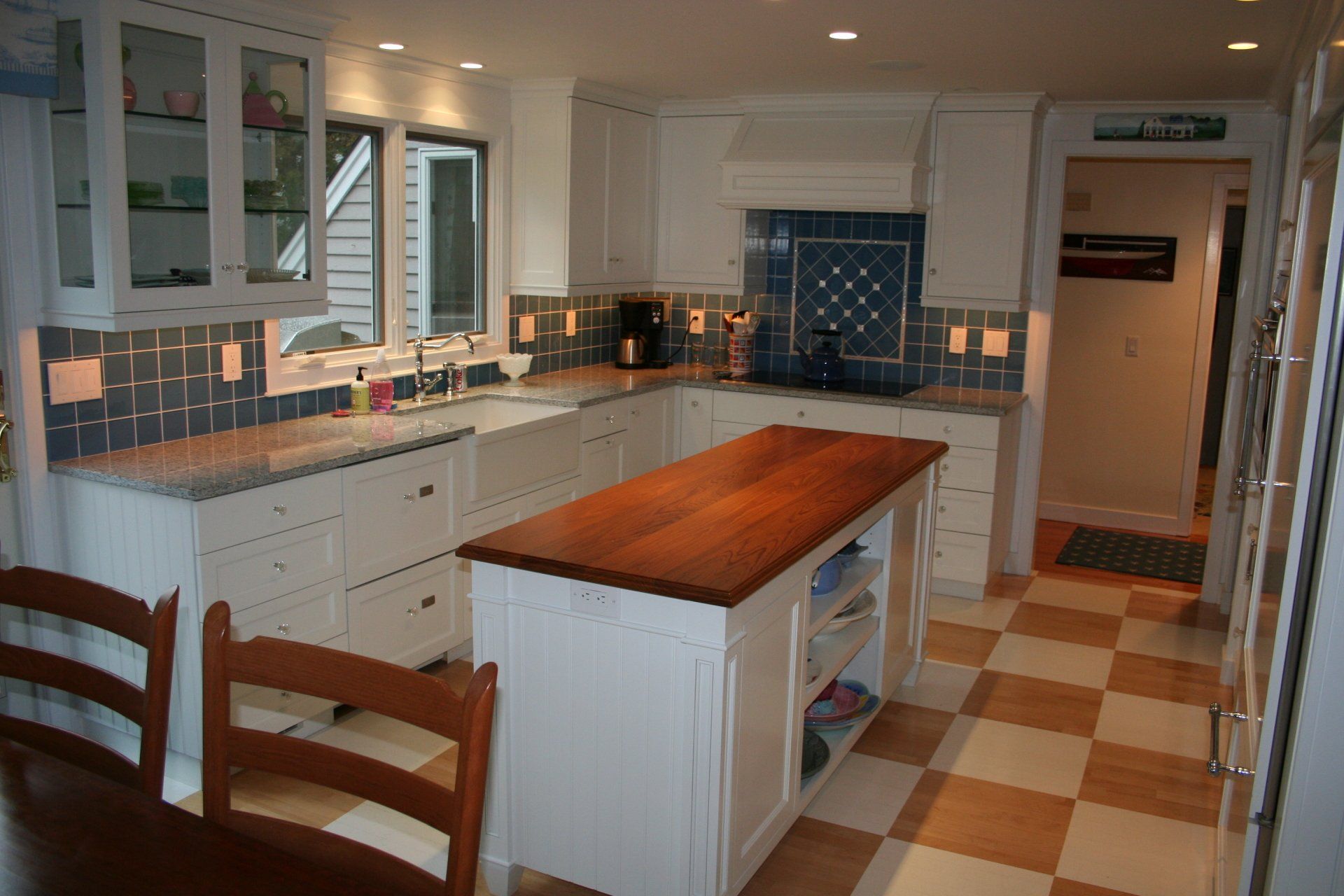 Red birch cabinetry with custom painted island.